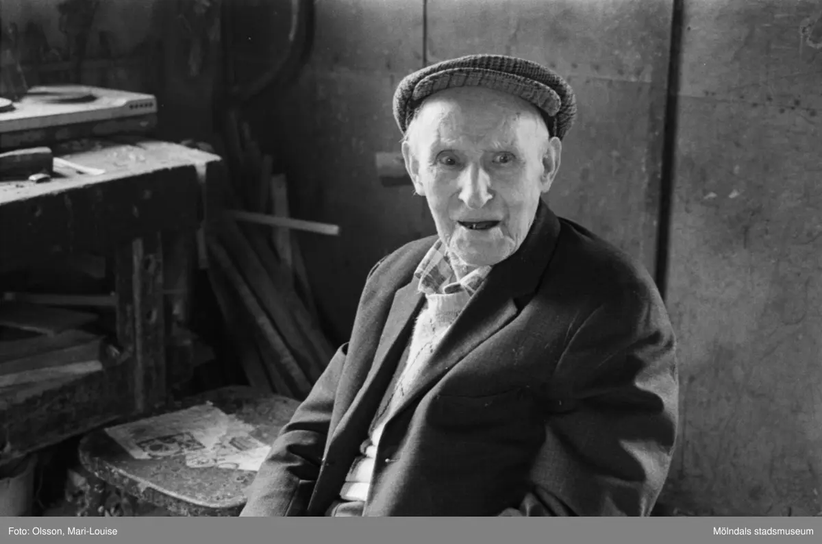 Gustav Johanssson i sin snickarverkstad. Han föddes 10/3 år 1900 på torpet Höganäs (på Berget) i Lindome.