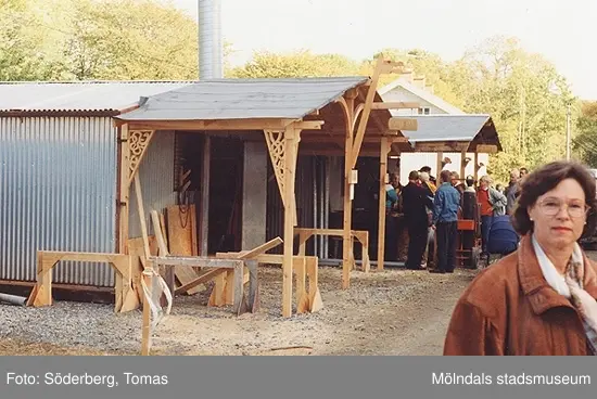 Gudrun Piculell, till höger i bild, som står framför hantverksbodar. Under senare delen av 1900-talet odlades marken invid Gunnebo slott endast i ringa utsträckning. Ett nytt drivhus återskapades 1996-1999, därav hantverksbodarna. Det vita huset "Solbacken", som syns i bakgrunden, var tidigare tjänstebostad för skogsvaktaren, chauffören och arrendatorn.