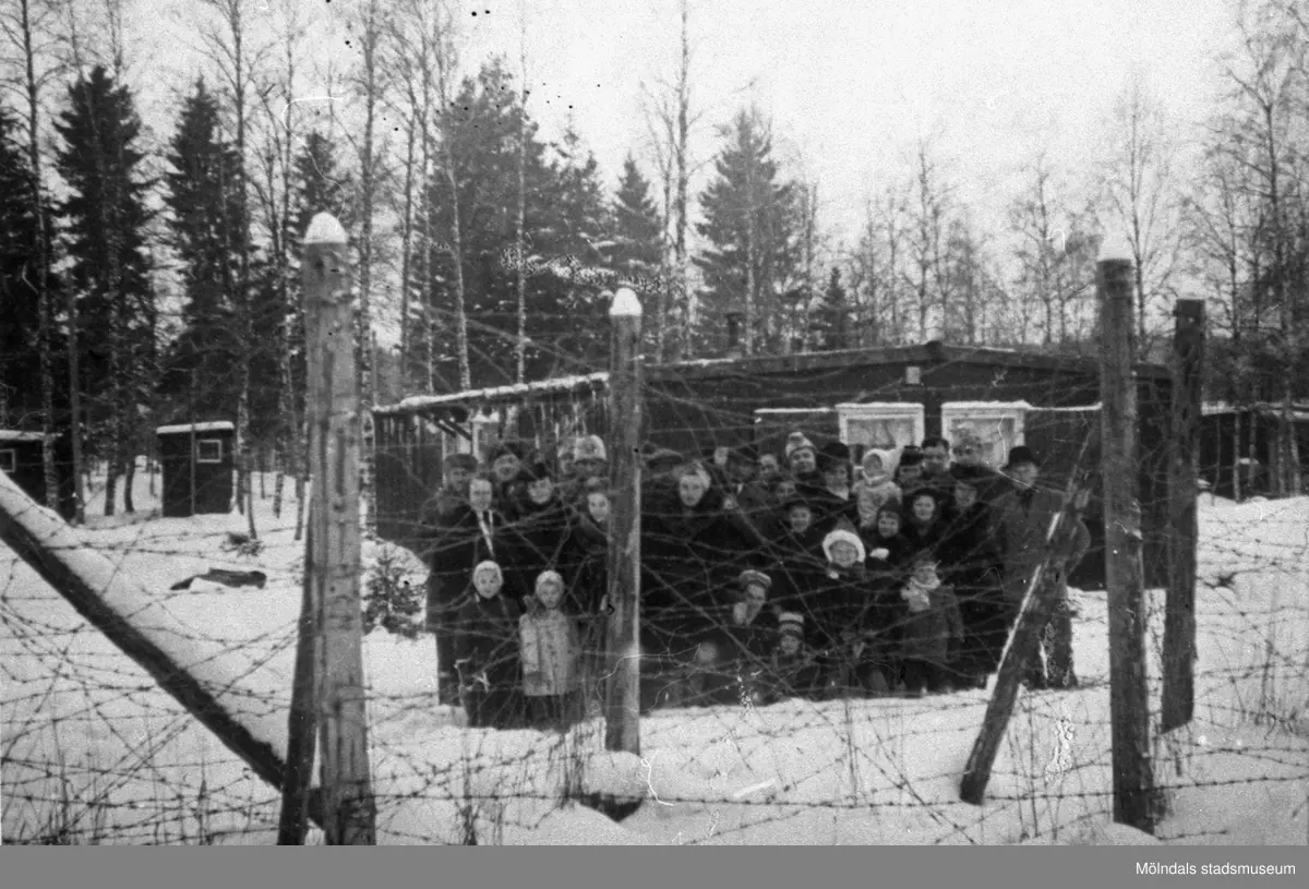 Estländska flyktingar i karantänläger hösten 1944. Familjerna står bakom en taggtråd som omringar det så kallade karantänlägret i Byringe, Örnsköldsvik. I lägren avlusades flyktingarna och de läkarundersöktes grundligt. Deras kläder och tillhörigheter brändes. Vid minsta sårbildning eller spricka i huden fördes flyktingarna till sjukhus. Rädslan för smittsamma sjukdomar var stor under rådande krig. Hösten 1944 flydde 32.000 estländare från kriget i Estland till Sverige. Ett sextiotal personer tog jobb på August Werners textilfabrik i Lindome.
