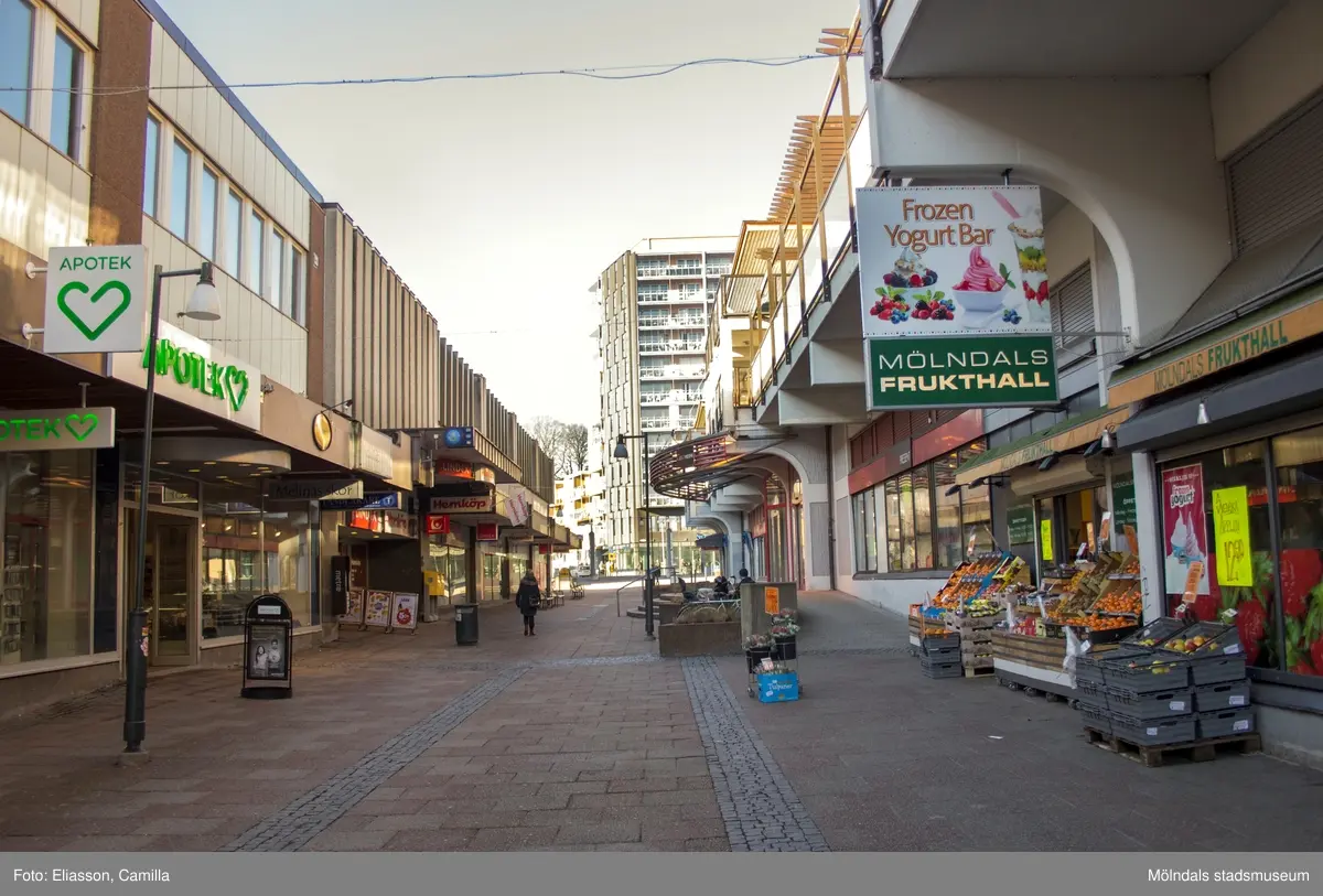 Alla hus vid gamla Frölundagatan (nuvarande Brogatan) är nu rivna, förutom tegelhuset till höger. Det var färdigt 1954 och inrymde då Gustaf Zackrissons möbelaffär. Mölndals-Posten finns nu i denna fastighet - som är helt inbakad i ett större byggnadskomplex. Området är delvis rivet och nytt affärscentrum är på gång. Höghuset längst upp på gatan ligger på Storgatan 32A.