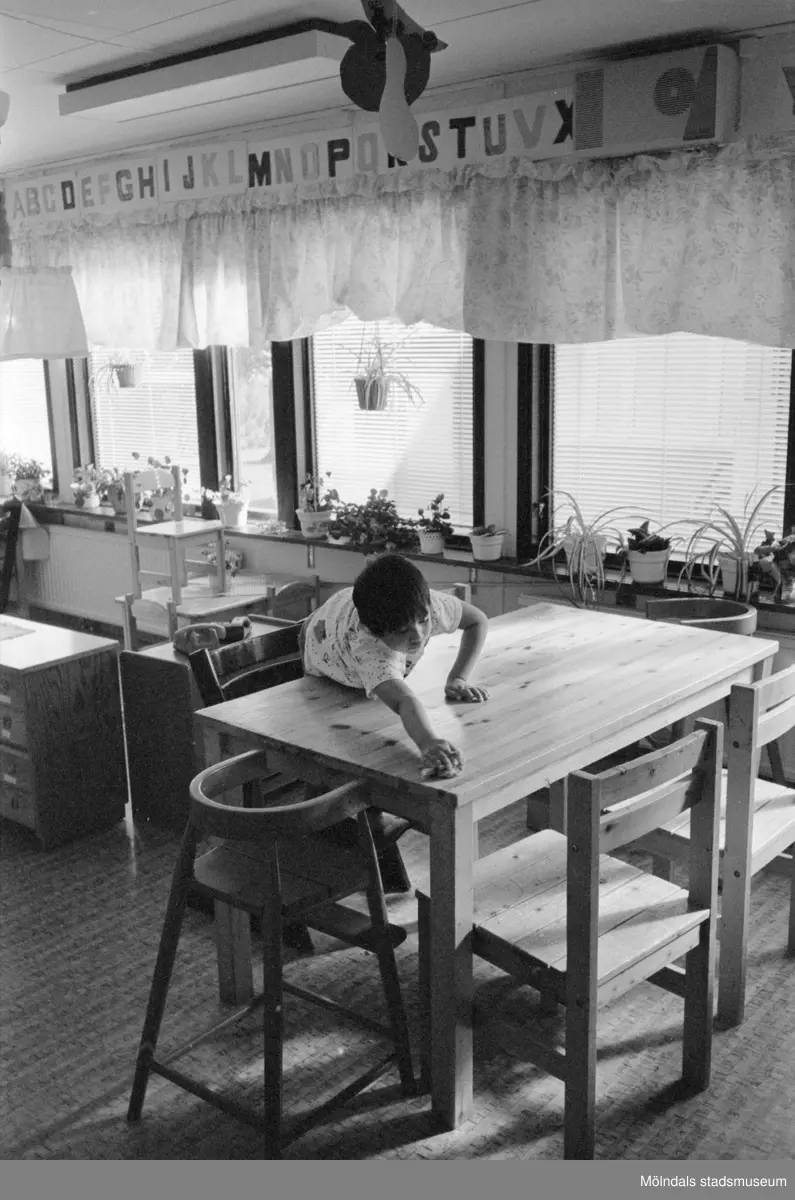 I köket på Katrinebergs daghem. En pojke har rest sig från sin trip trap stol och sträcker sig över köksbordet av furu. Han torkar med en trasa på bortre delen av bordet. I bakgrunden ser man fönster med gardiner. Ovanför hänger tavlor av versaler i bokstavsordning.