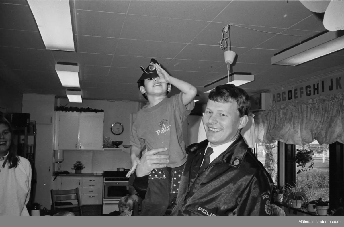En uniformsklädd polis håller en pojke i famnen. Båda tittar leende mot kameran. Pojken har polismannens mössa på sitt huvud. De står i Katrinebergs daghems kök och i bakgrunden ser man några barn samt deras fröken. På väggen hänger teckningar med versala bokstäver, en på varje blad.