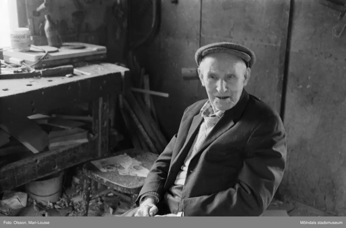 Gustav Johanssson i sin snickarverkstad. Han föddes 10/3 år 1900 på torpet Höganäs (på Berget) i Lindome.