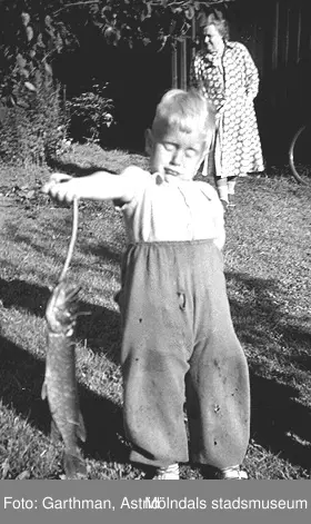 Alf Garthman håller upp en gädda. Sommar i Stannum (Olstorp, Gråbo), 1950-tal.