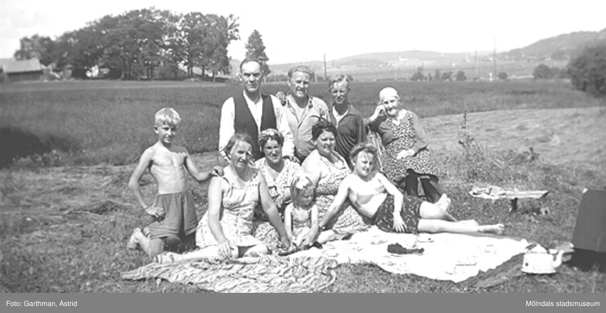 Gustav Anderssons släkt i Fjärås, 1940-tal. Okända av givaren. I bakre raden, andra från vänster står Gustav Andersson, hustrun "Gullan" (givarens faster) sitter i främre raden nr två från höger.