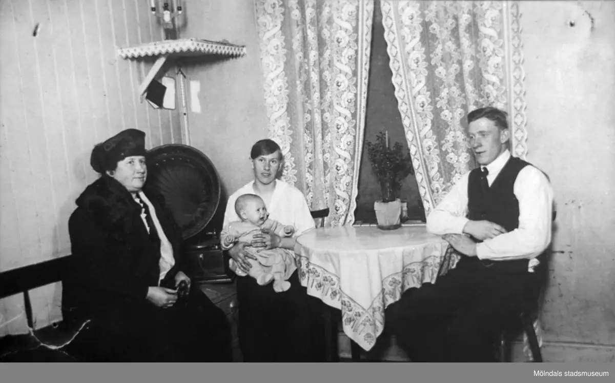 Familjen Karlsson sitter i köket på Kvarnfallet 31, år 1922. Från vänster: okänd dam, Alma Karlsson med dottern Astrid i knät och Viktor Karlsson.