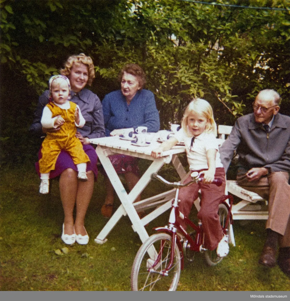 En grupp människor sitter och dricker kaffe i bersån, Kryssgatan 18 ("Stusshålan") i Mölndal. Från vänster Berit Gustafsson med dottern Christine i knäet, därefter Berits mor Anna Larsson (född Hasselberg), storasyster Ingela på cykel och morfar Ernst Larsson.