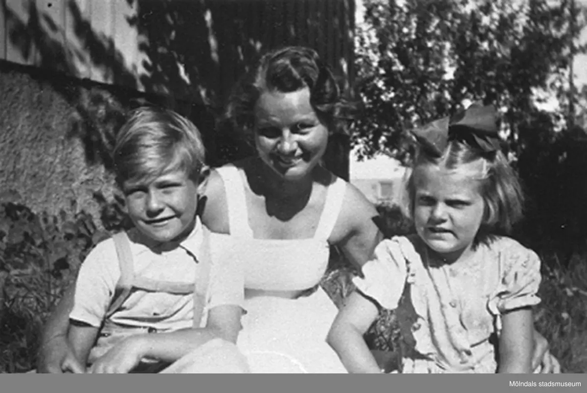 Två barn med bitr. föreståndare Margit Emilsson (gift Wannerberg -52) i mitten, 1948 - 1951. Krokslätts daghem, Dalhemsgatan 7 i Krokslätt.