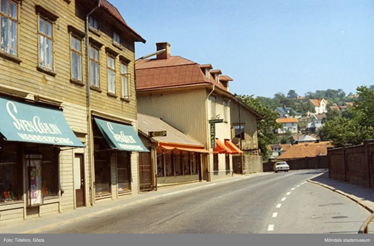 Kvarnbygatan 25-27, 1960-tal. Husen låg mitt emot Papyrus port. Till vänster ses Sven Ahlin Herrekipering ("Frituna" på Kvarnbygatan 25). Husen är idag rivna.