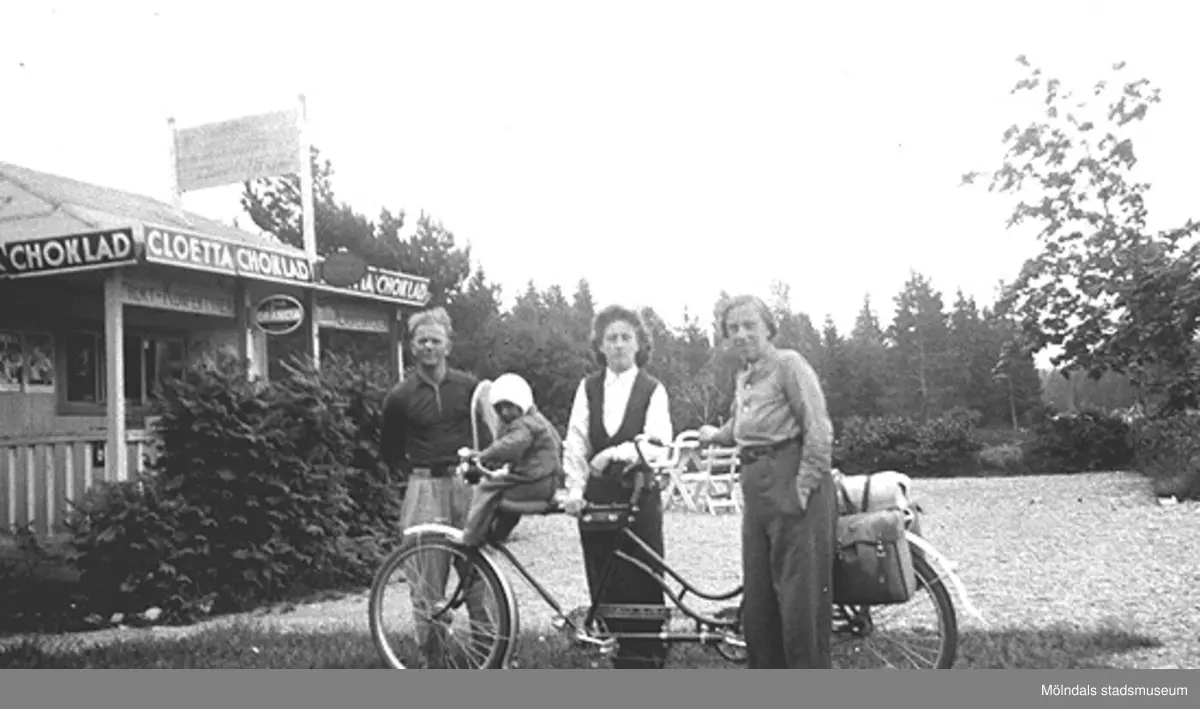 Cykelsemester på tandem i Bohuslän för syskonen Rolf (i korgen) och Astrid Karlsson (gift Garthman) samt deras mor Alma. Längst till vänster står Astrids dåvarande fästman. Astrid är givarens mor och Alma Karlsson är mormor. 1930-tal.