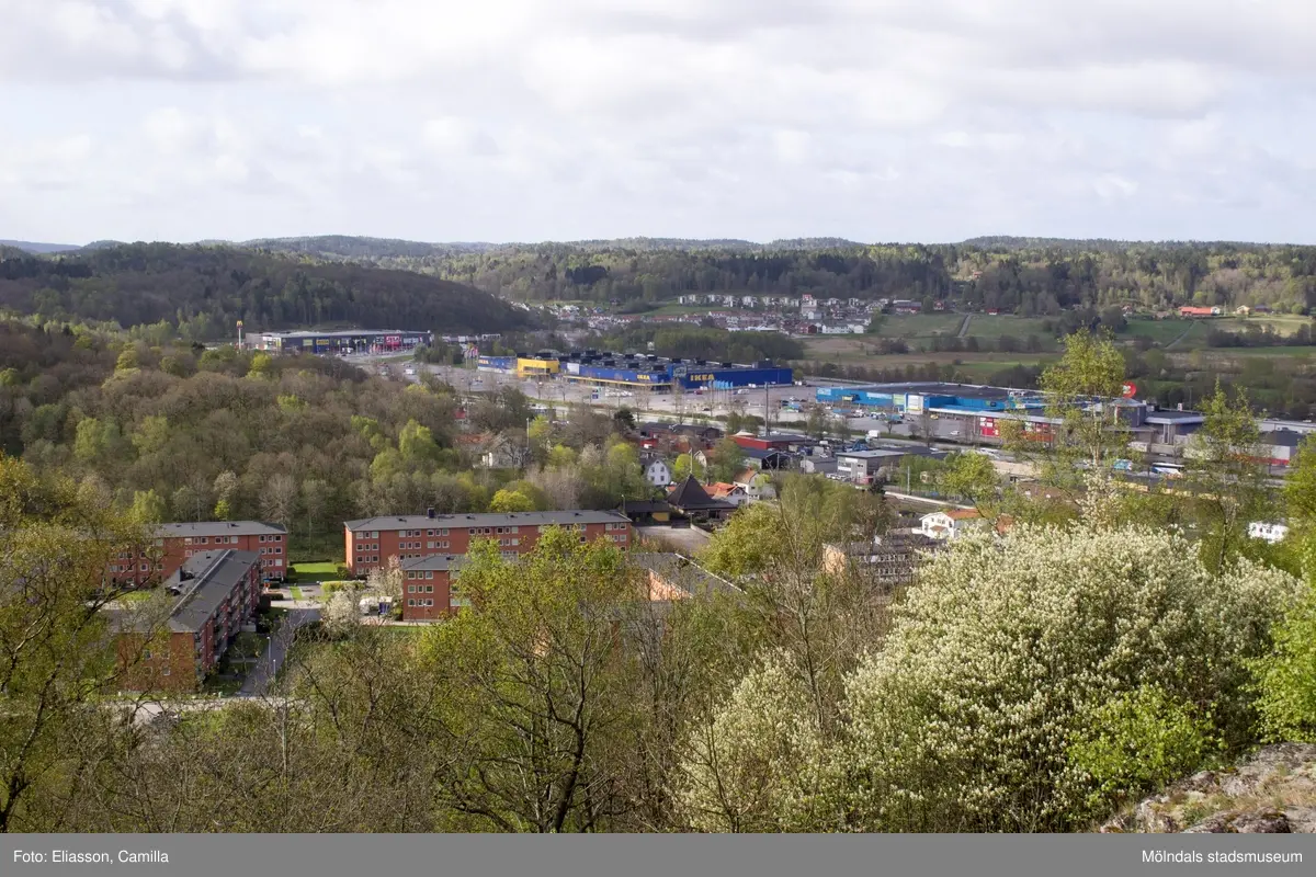Vy från Brattåsberget mot IKEA Kållered (blå-gult i bild). Idag har detta köpcentrum växt åt alla håll. Det röda bostadsområdet, till vänster i mitten, är Vommedalsområdet. I fonden snett bakom/ovanför IKEA ser man också de nya bostadsområdena i Heljered.