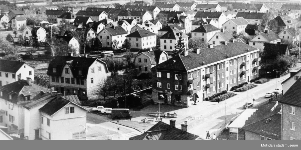 Åt vänster i förgrunden ses Frölundagatan (nu Brogatan) och Storgatan åt höger. I bildens nedre vänstra hörn syns huset med Andren´s Möbler (gatunr 28) och därbredvid huset som kallades "Biljarden" (Frölundagatan 26). I bildens centrum ligger Berghedes Blommor, Frukt och Kiosk. Vid nedfälld markis: Dolemans Bageri.