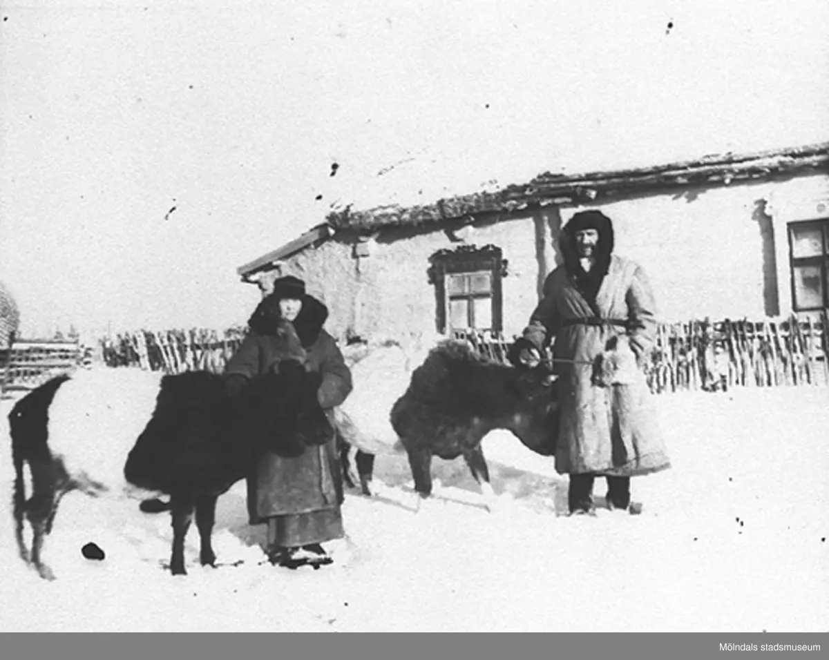 Saidas föräldrar i Sibirien år 1956. Anna och Ivan Rosin tvångsförflyttades (deporterades) från Estland till Sibirien 1950. De var där i nio år och lyckades bygga upp en dräglig tillvaro med kor, höns och egen trädgård. I bakgrunden ses deras eget hus. Kossorna hette Vera och Hjärta. Hösten 1944 flydde 32.000 estländare från kriget i Estland till Sverige. Ett sextiotal personer tog jobb på August Werners textilfabrik i Lindome.