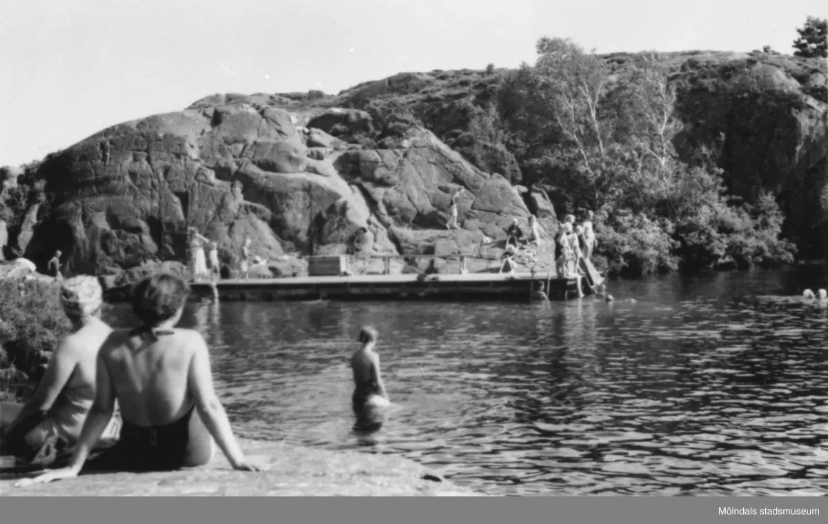 Simskola vid bryggan i "Bergsjön" (Färåstjärn) i Kållered, en sommardag på 1950-talet.