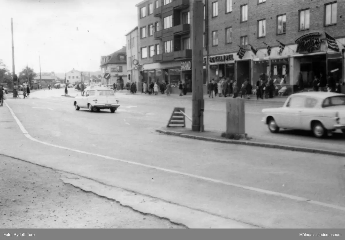 Biltrafik på Göteborgsvägen i Mölndal i riktning mot söder på 1960-talet. I bakgrunden ses närmast huset Göteborgsvägen 1-5. Huset kallas Centrumhuset eller Frändbergska huset.