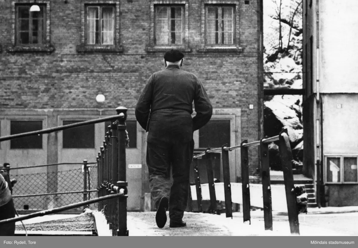 Herr Larsson på väg över Forsebron i Mölndals Kvarnby en vinterdag ca 1966-1967. I bakgrunden ses byggnaden Kvarnbygatan 41, tidigare brandstation och garage för polisbilar, numera Mölndals målarskola.