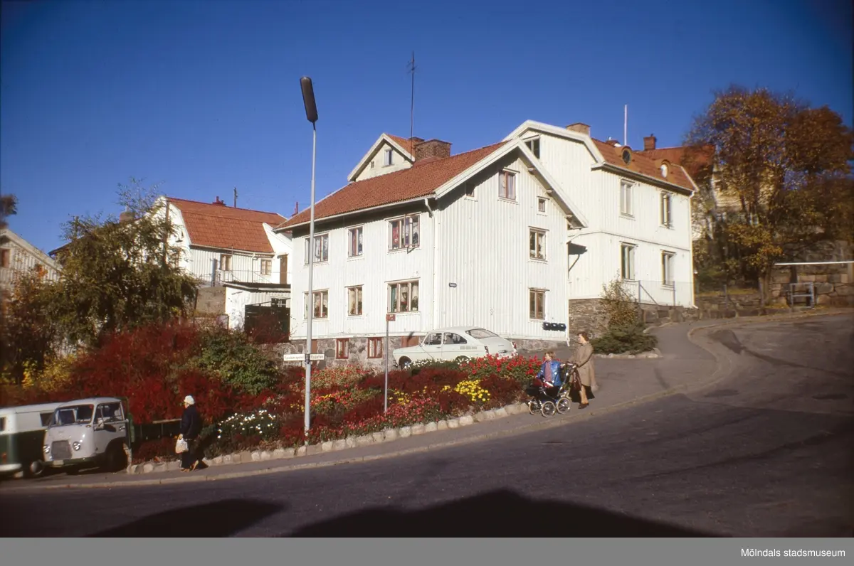 Roten M 19 och 20 vid Rygatan i Mölndals Kvarnby, 1970-tal. Vy från Norra Forsåkersgatan.