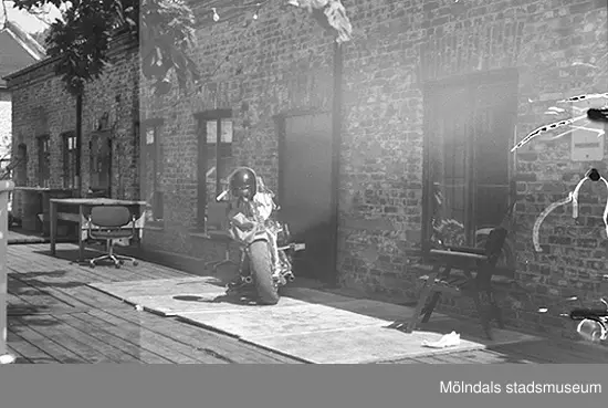 Trädgårdsmöbler och en motorcykel står utanför huset, hösten 1994. Tegelbyggnad tillhörande före detta spinneriet Bettyholm/Carlsfors/Forsåkers fabriker "övre".