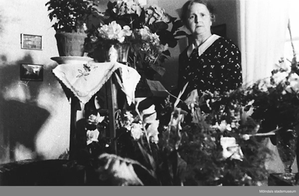. Nora (mormor till givaren) sitter vid ett blomsterbord.