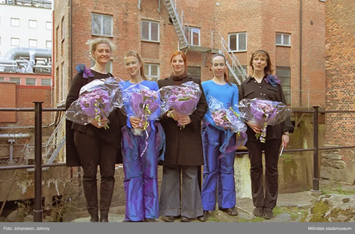 Kvarnbydagen 28 april 2002. Danstillställningen ForsAndes dansare: (i blått) Tina Andersson och Åsa Thegerström. Koreografi och kostym: Torun Odlöw. Kulning: (i svart) Helena Kramér och Caroline Lindström. I bakgrunden ses Soab och Oljeslageriet (F-fabriken, Kvarnhjulet 10).