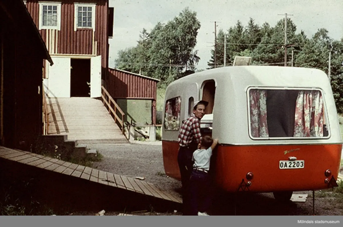 En okänd gör en kontroll av färdig husvagn, Lamellplast, våren/sommaren 1960.