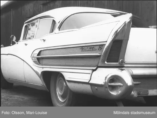 Buick - en 1950-tals bil, fotad snett bakifrån. Bilden togs i samband med utställningen "Från näckens polska till rockens roll" som pågick 1 december 1990 - 31 december 1991 på Mölndals Museum. Relaterade motiv: 2007_0442 - 0443.