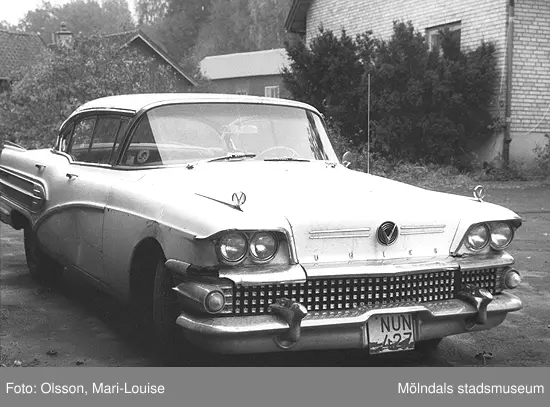 Buick - en 1950-tals bil, fotad snett framifrån. Bilden togs i samband med utställningen "Från näckens polska till rockens roll" som pågick 1 december 1990 - 31 december 1991 på Mölndals Museum.