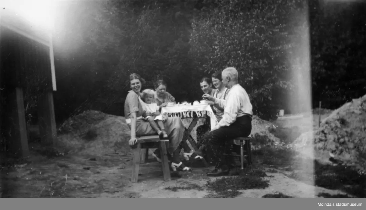 Kvinnor, män och ett barn vid ett dukat kaffebord utomhus. Bilden märkt: "Från Kållered". 1930-tal.