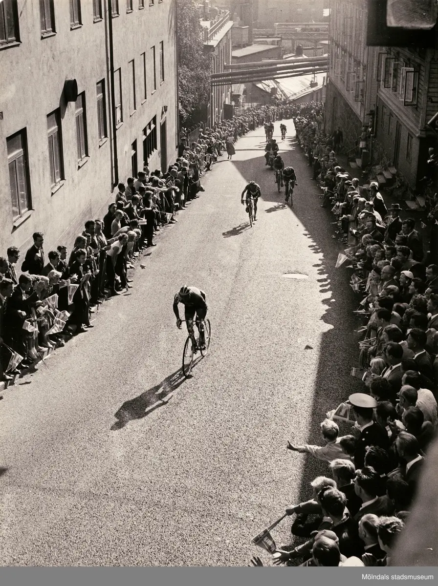 Cykel-SM i Mölndal, år 1956. Tävlingscyklister tar sig uppför "Kråkan", Kvarnbygatan, under seniorernas 18-milslopp söndagen den 5 augusti. Backen kantas av stor publik på båda sidorna. Starten gick klockan 12 och inleddes med en varvbana inom Mölndal på följande gator: Järnvägsgatan-Kvarnbygatan-Stensjögatan-Muraregatan-Gunnebogatan-Järnvägsgatan. Varvbanan kördes tre gånger varefter cyklisterna åkte landsvägsslingan på ca 13 mil över Landvetter-Härryda-Hällingsjö-Älvsåker-Ubbhult-Hällingsjö-Inseredsos-Eskilsby-Härryda-Mölnlycke och när de åter kom till Mölndal åktes ovan nämnda varvbana åtta gånger till. Segrade gjorde Roland Ströhm före tvåan Karl-Ivar Andersson och Lars Nordwall på bronsplats.
