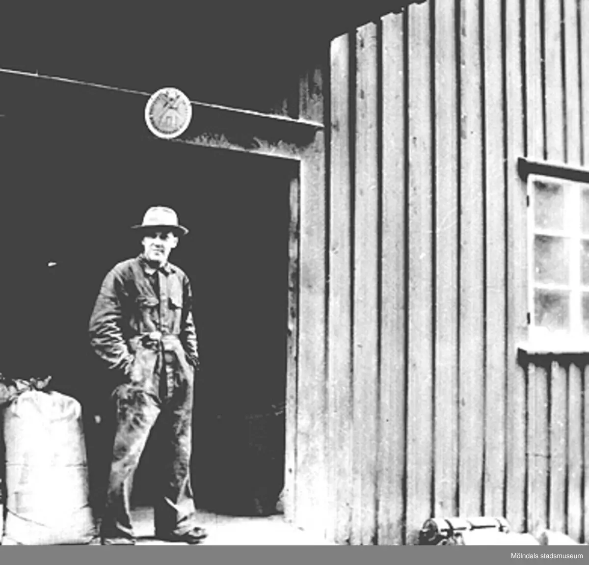 Mjölnaren Ernst Ellerot vid lastbryggan utanför Ålgårdsbacka kvarn. Fotograf och årtal är okänt.