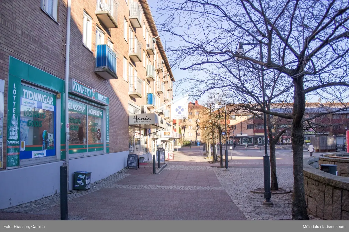 Bild 1: Mölndals torg 1-5 (Havskatten 12), år 2015. Bild 2: hörnet av Mölndals torg/Brogatan. Bild 3: Brogatan västerut. Bild 4: Konfekthuset på Mölndals torg 1. Dokumentation av platsen innan rivning och nybyggnation.