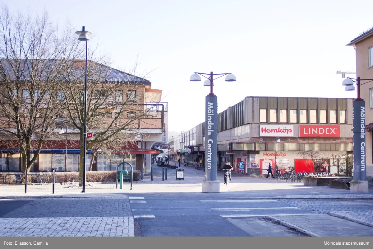 Vy från Storgatan mot Brogatan, år 2015. Till höger skymtas höghuset på Storgatan 32A. Platsen där den vänstra "Mölndals Centrum"-skylten står, blev senare Ulla Jacobssons Plats. Bild 4: till vänster ses Bergmansgatan. Dokumentation av platsen innan rivning och nybyggnation.