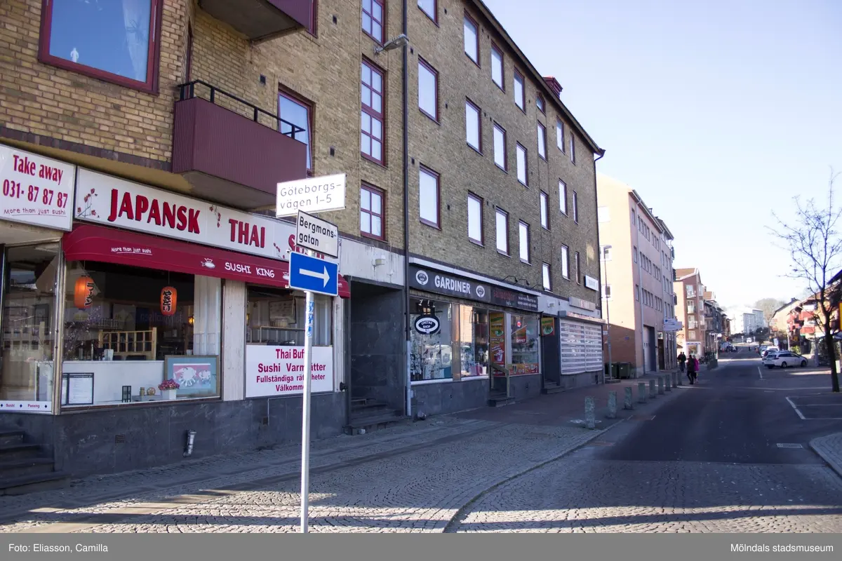 Bild 1: Bergmansgatan 1 (Sushi Thai King) sedd från Göteborgsvägen (Havskatten 3), år 2015. Bild 2: Bergmansgatan 3 (USA Nails och Salong Härligheten) samt Bergmansgången med Havskatten 3 till vänster, Havskatten 17 till höger. Bild 3-4: Längre in på Bergmansgången. Dokumentation av platsen innan rivning och nybyggnation.