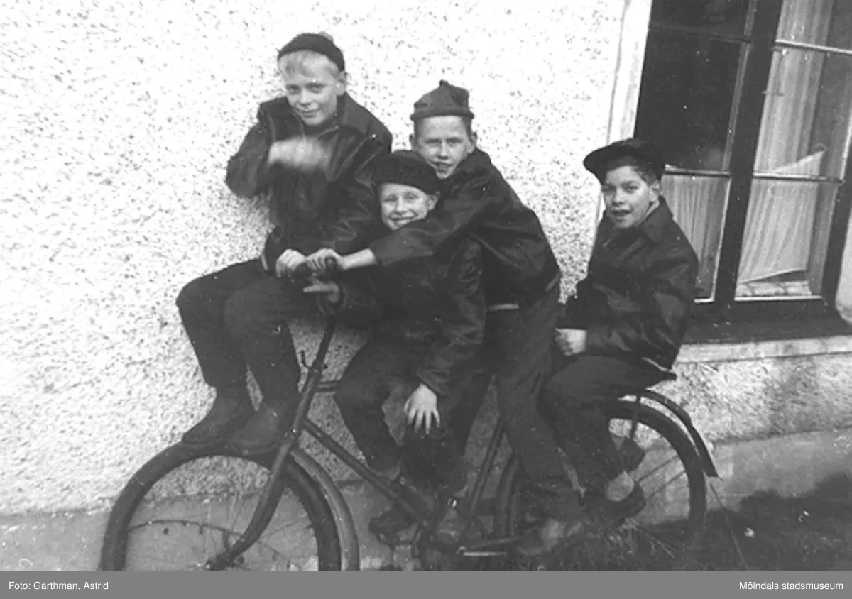 Fyra killkompisar som poserar på en cykel vid Barnhemsgatan 21 ungefär 1957-1958. Från vänster: Roger Karlsson, Alf Garthman, Sune Johansson och Lennart Hedberg.