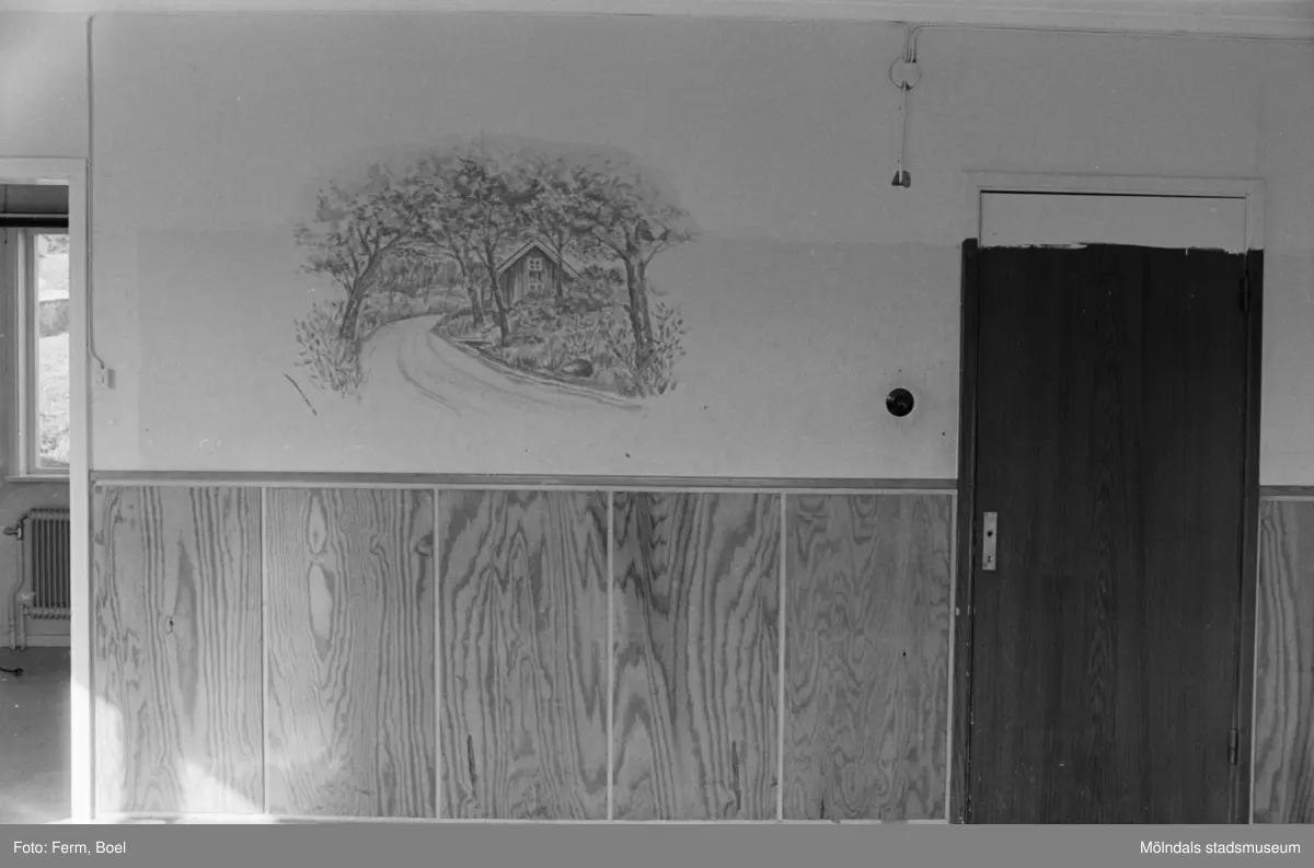 Dokumentation av väggmålningar i Ryets bibliotek 1992. Biblioteket har tömts på grund av nedläggning. Här är en målning av Mosstorpet i Lackarebäck, långt upp i Svejserdalen.