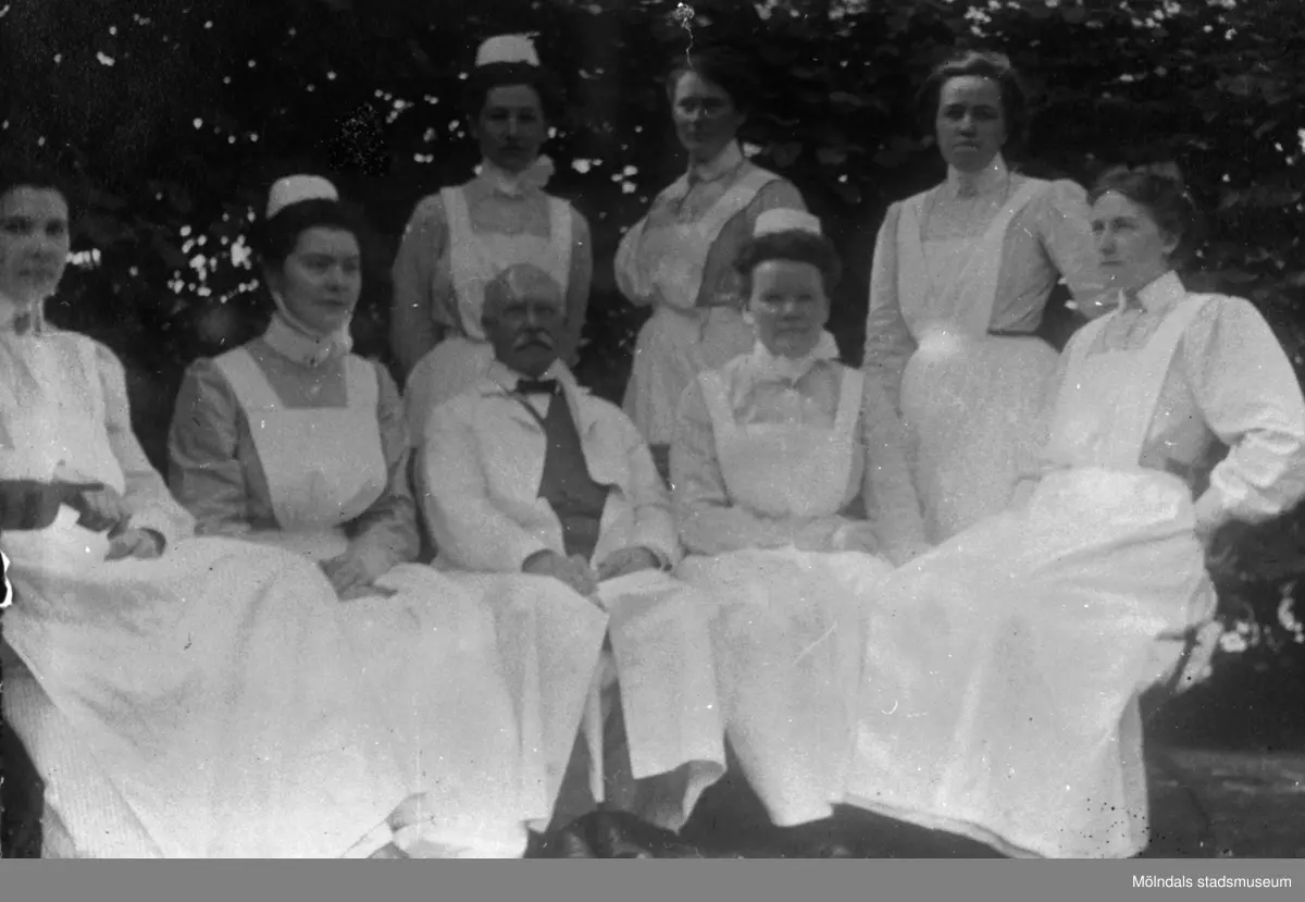 Personal utanför Mölndals sjukstuga på Forsåkersgatan 19 år 1909.