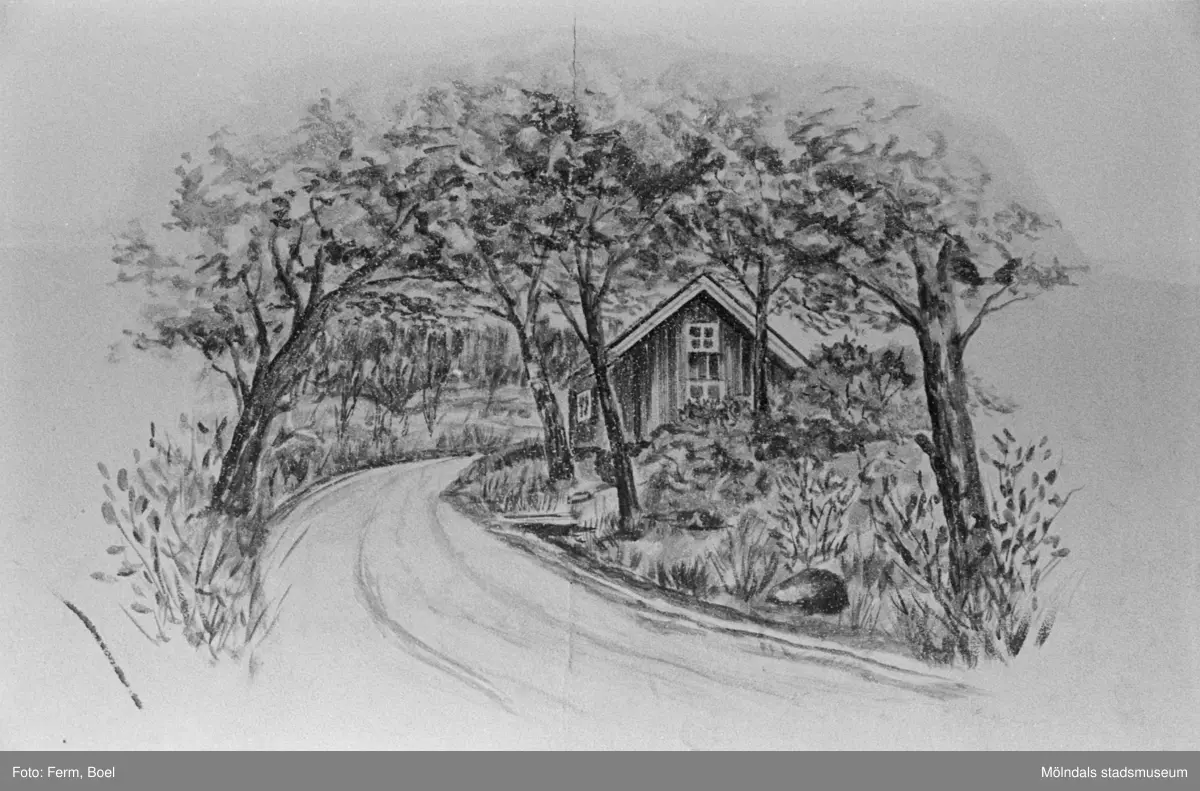 Dokumentation av väggmålningar i Ryets bibliotek 1992. Biblioteket har tömts på grund av nedläggning. Här är en målning av Mosstorpet i Lackarebäck, långt upp i Svejserdalen.