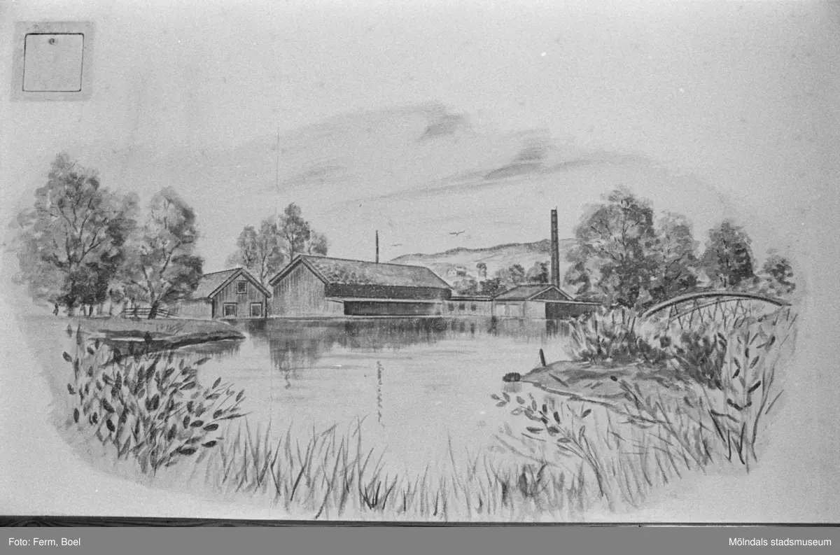 Dokumentation av väggmålningar i Ryets bibliotek 1992. Biblioteket har tömts på grund av nedläggning. Här ser man Kvarnfallet 31 vid Grevedämmet. Till höger ses Sågdalens järnvägsbro.