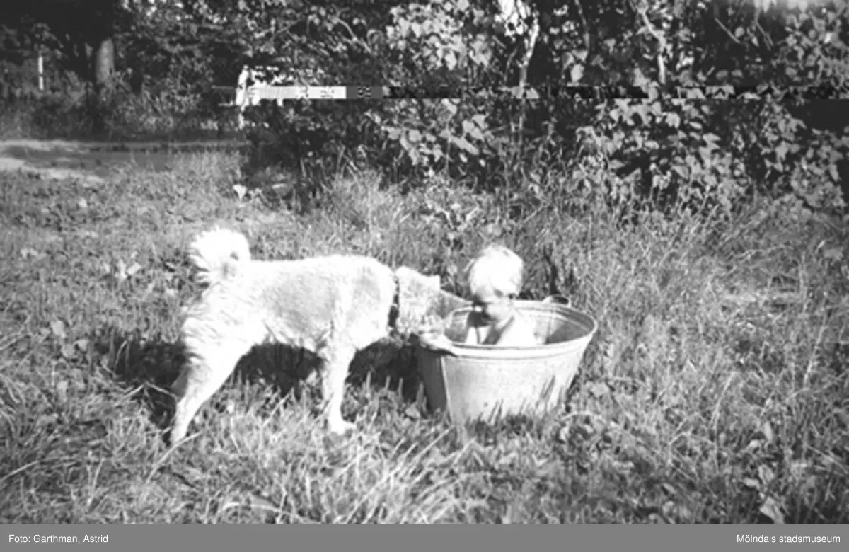"Hunden Moberg 2 är intresserad av vad som finns i baljan jag (Alf Garthman) sitter i". Barnhemsgatan 21, 1950-tal. Alf arbetade i många år på Mölndals stadsmuseum.