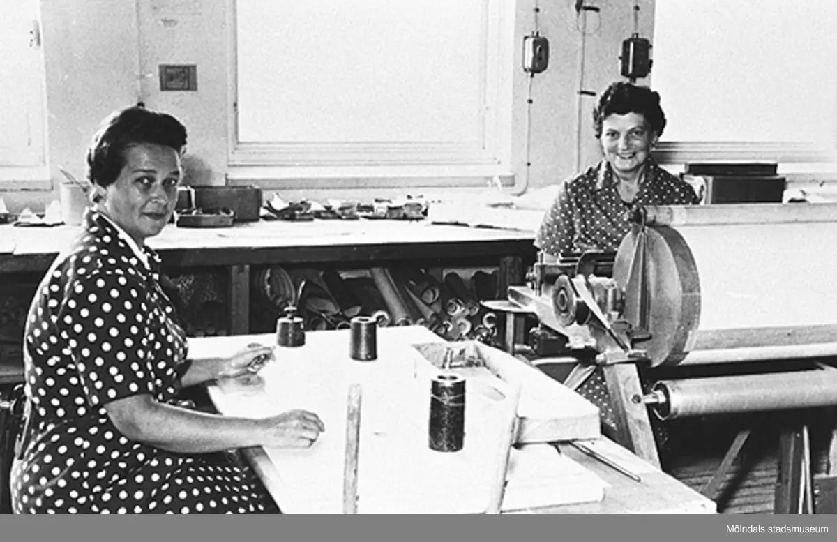 Från vänster: Margit Magnusson och Maja Brandberg håller på med upprullning till tapetlängder vid Tengblads Tapetfabrik, 1950-tal.