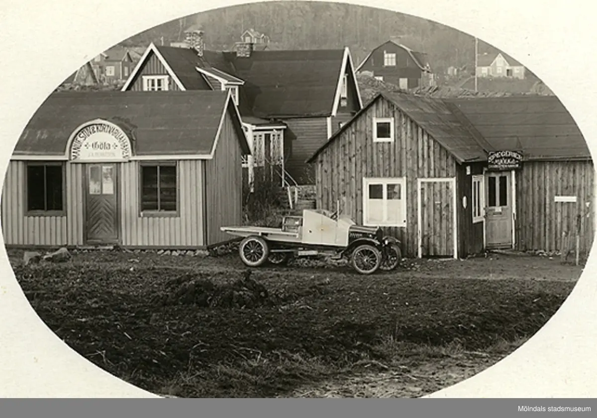 Vykort taget vinkelrätt mot det gamla huset i bakgrunden fastigheten "Körsbäret 19", Högadalsgatan 2B (fastighetsbeteckningen och adressen finns ej längre), nuvarande Toltorpsdalen i Mölndal, kring sekelskiftet 1900.