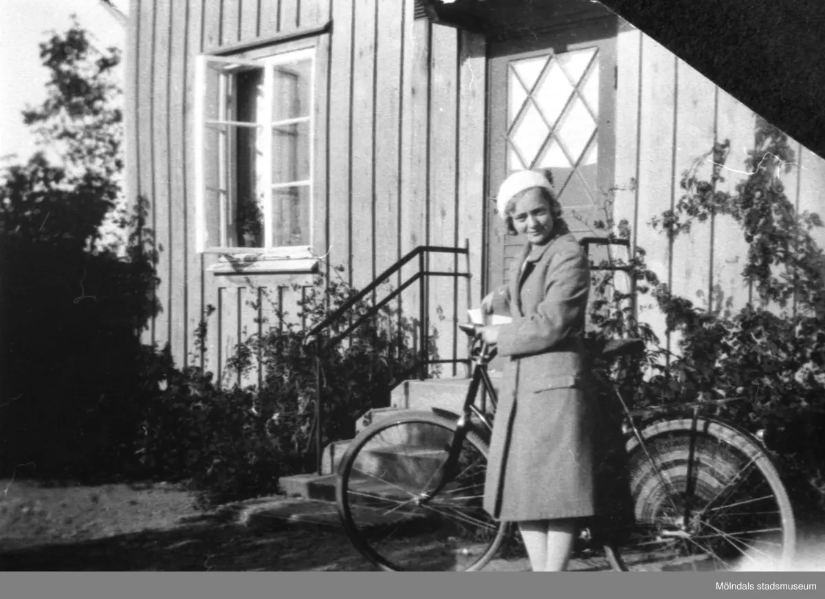 Rosa Pettersson (född Krantz) står vid sin nya cykel, troligtvis 1932. Hon står utanför personalbostaden på Stretered.