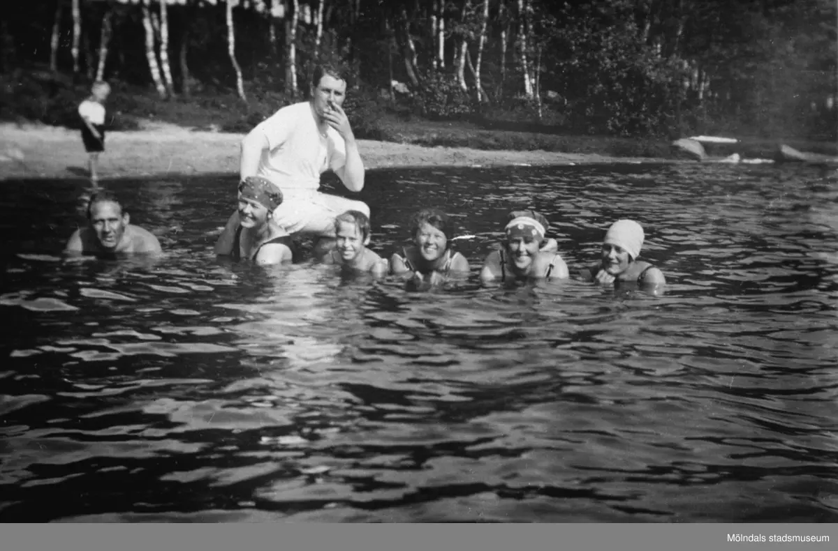 Några personer badar i Tulebosjön, 1930-tal. Det är antingen familjen Alberts eller sommargäster. I bakgrunden till höger ses en strand och träd.