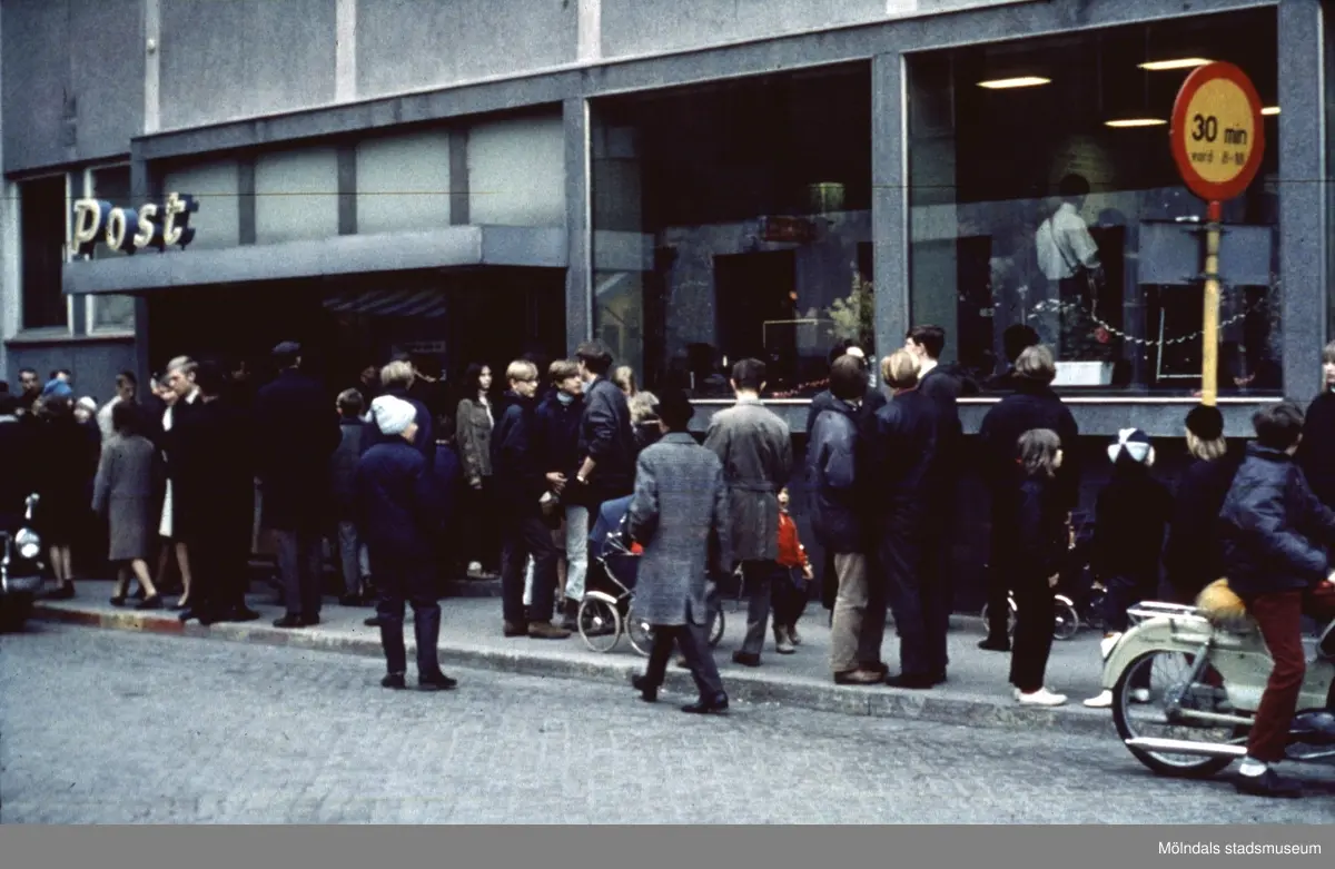 Folksamling utanför postkontoret på Frölundagatan (idag: Brogatan) i Mölndal, 1970-tal.