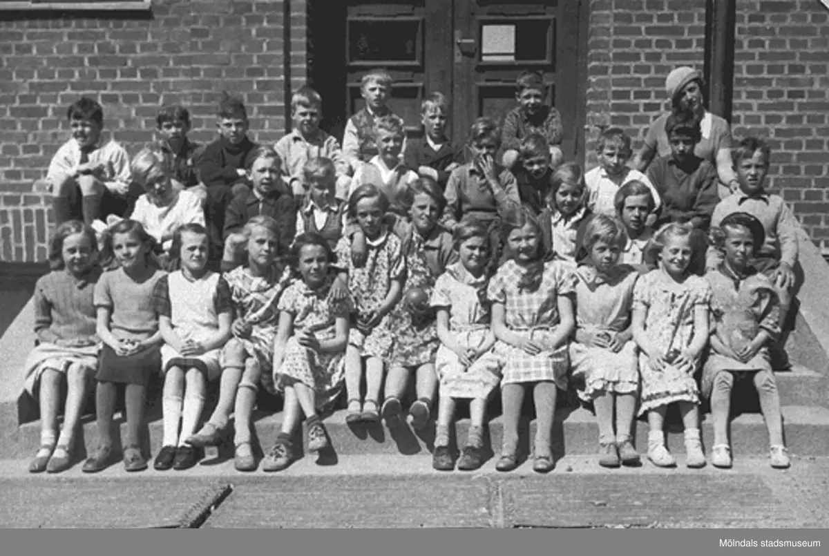 Tredje året, vt 1936. Stina Berglund. På trappan till nya skolbyggnaden. (Siffror hänvisar till kalkerpapper medföljande positivet.) 1. Rune Johansson, 2. Rudi Vasen, 3. Jean Brandin, 4. Karl Erik Bergström-Lindström, 5. Sune Nilsson, 6. Per Olof Berntsson, 7. Stig Gustavsson, 8. Elon Stoltz, 9. Helge Andersson, 10. Gert Larsson, 11. Evert Hulterström, 12. Rolf Fant, 13. Gustav Nilsson, 14. Allan Hultgren, 15. Rune Andersson, 16.Rune Olsson, 17. Kerstin Magnusson, 18. Dagny Rosell, 19. ??, 20. Agnes Glans, 21. Elly Nygård, 22. Kerstin Andersson (min kusin), 23. Inger Sjögren, 24. Irma Floman, 25. Anna Lisa Östling, 26. Ulla Segerholm, 27. Gulli Andersson, 28. Mary Larsson, 29. Rut Larsson, 30. Kate Andersén. Fotot märkt 4 på baksidan.