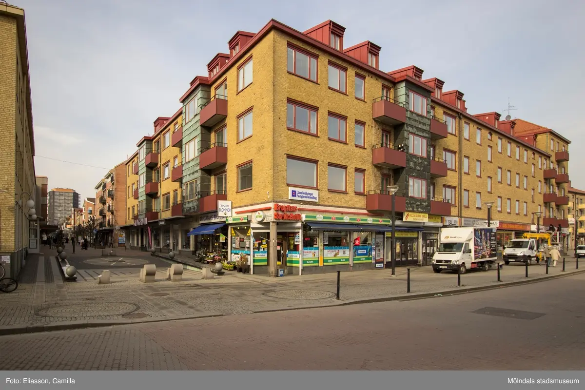 Mölndals centrum sett från Broplatsens buss- och spårvagnshållplats. Frändbergska huset kallades länge ”Centrumhuset” och ansågs vara hjärtat i Mölndals nya köpcentrum. Det byggdes i två omgångar, den vänstra delen uppfördes 1937-1938 och den högra 1952. Olyckligtvis byggdes huset med källare i ett av Sveriges mest översvämningsdrabbade områden. Huset ligger i början av Brogatan (tidigare Frölundagatan). Det kommer att bevaras även vid nybyggnation. I slutet av Brogatan syns höghuset på Storgatan 32A.