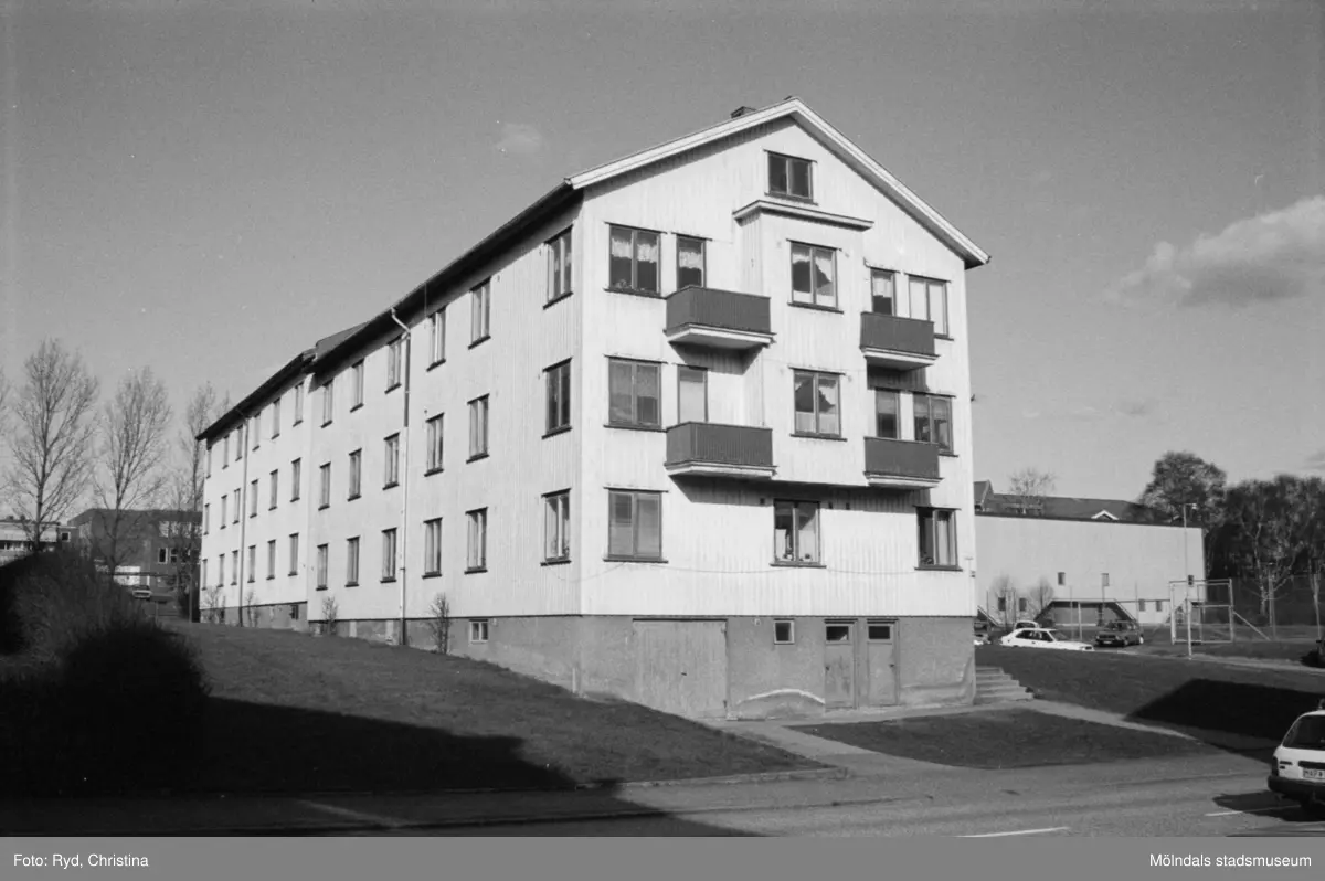 Vy från Krokslätts Parkgata, 1992. Kvarteret Illern; höger huskropp: Krokslätts Parkgata 44 A-C samt vänster huskropp: Bäckeforsgatan 25 A-C. Sörgårdsskolan skymtar i bakgrunden till vänster och idrottshallen ses till höger.