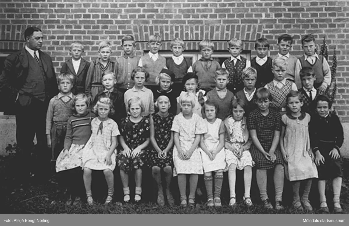 Helge Andersson, Per Olof Berntsson, Evert Hulterström, Ingemar Ekström, Rune Olsson, Rudi Vasen (som nyss tillsammans med övriga familjen hade flytt hit från Tyskland), Rune Johansson, Jean Brandin. Mellersta raden: Gustav Nilsson, Rune Andersson, Agnes Glans, Irma Floman, Gulli Andersson, Karl Erik Bergström-Lindström, Elon Stoltz, Allan Hultgren, Rolf Fant. Nedersta raden: Ulla Segerholm, Kate Andersén, Rut Larsson, ??, Mary Larsson, Inger Sjögren, Kerstin Magnusson, Dagny Rosell, Kerstin Andersson (min kusin), Anna Lisa Östling. Lärare: Albin Sahlin. Fotot märkt 3 på baksidan.