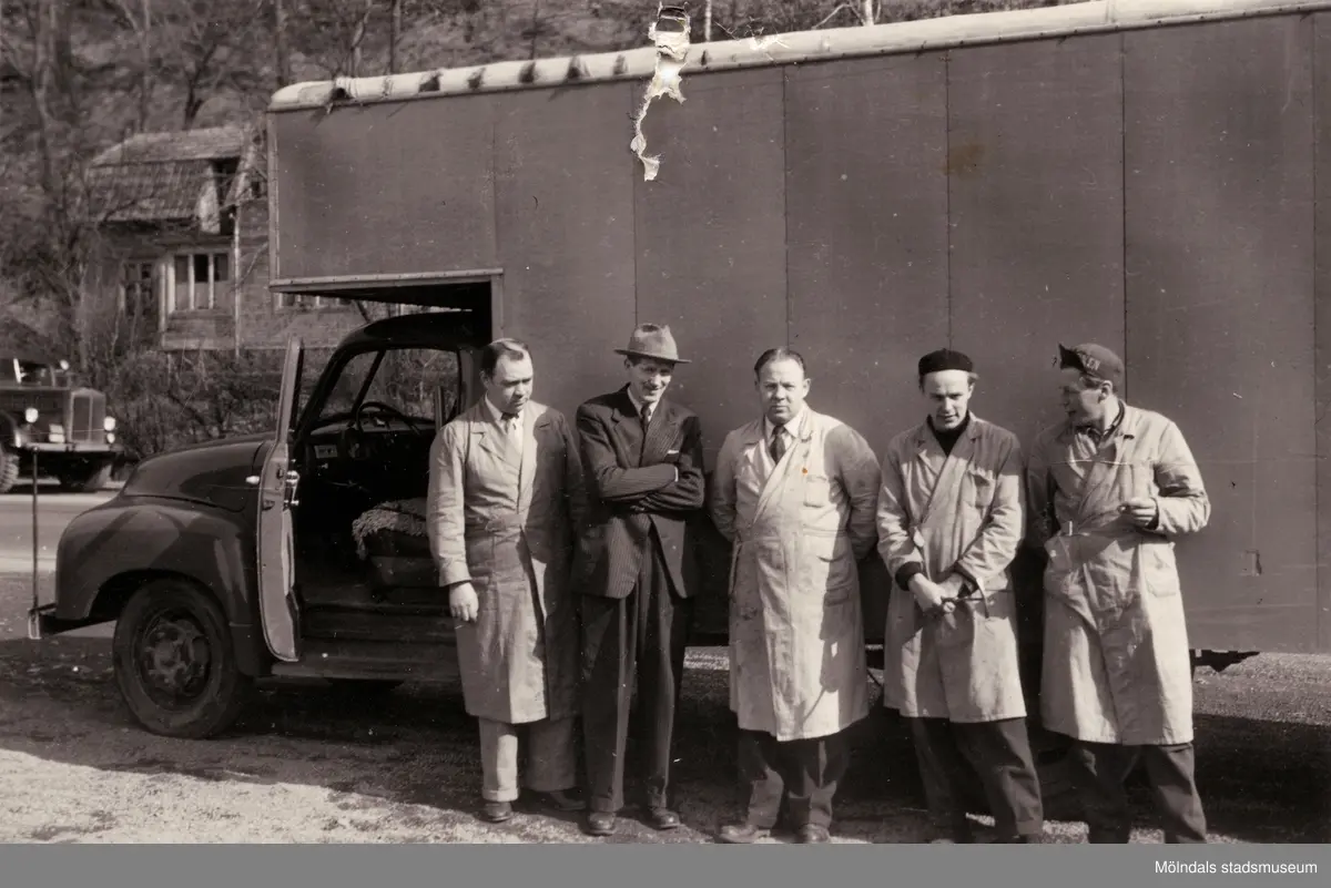 Kållereds Fåtöljindustri vid Torrekullavägen i Kållered. Verkstadens utsida mot Kungsbackavägen. En lastbil, Opel Blitz, från Aron Karlssons Möbler i Varberg hämtar produkter och poserar. Från vänster ses Paul Kristoffersson, Vidar Andersson (chauffören), Olof Kristoffersson, Göte E. (från Ranered, Hällesåker) och Olof Johansson.