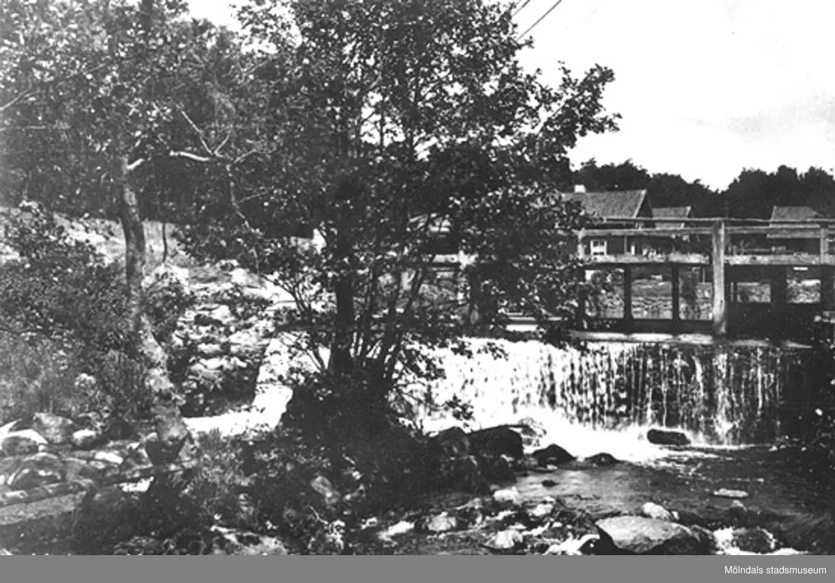 Fördämning och fall vid Lindomeån på 1920-talet. De nya bostäderna som kom efter "Byggningen".